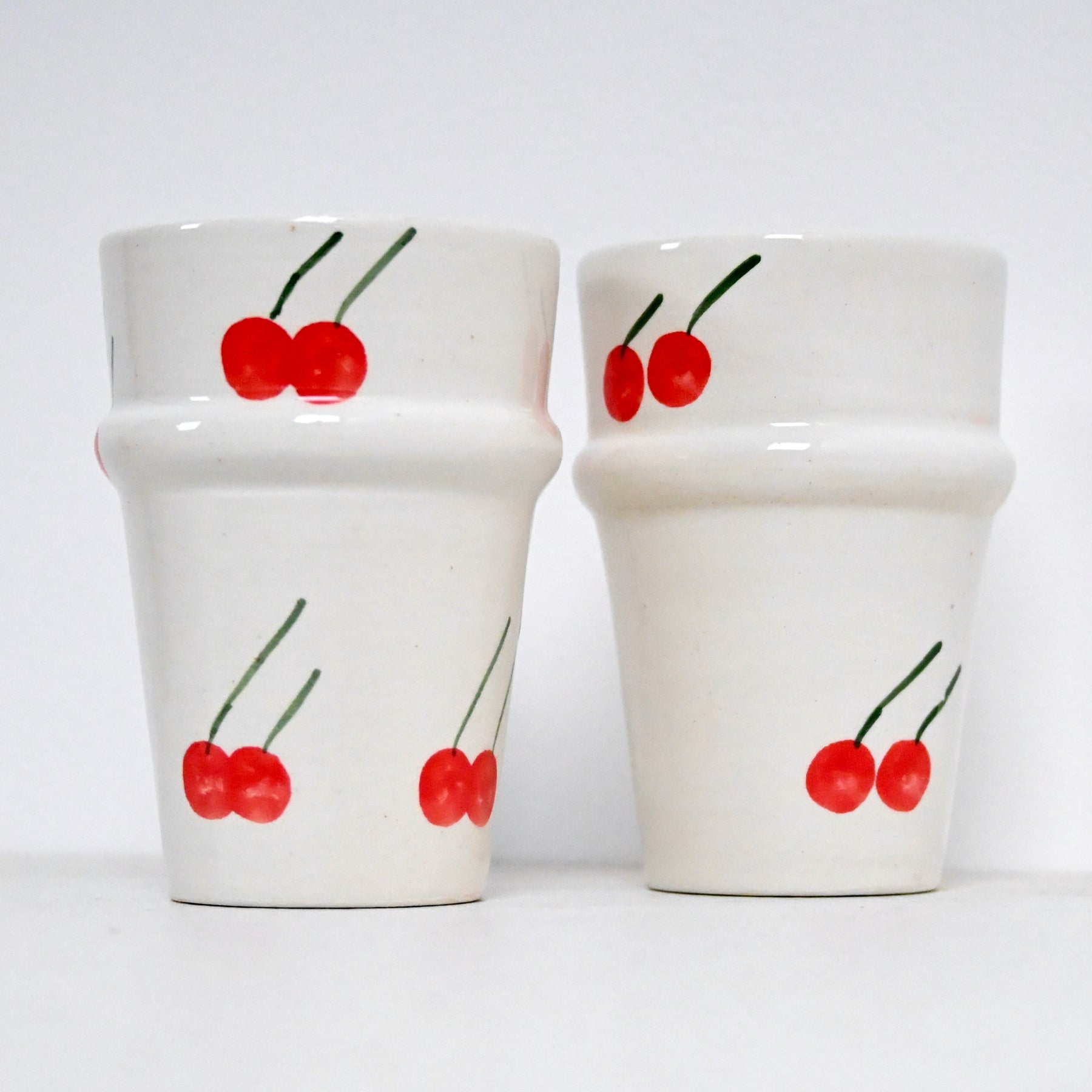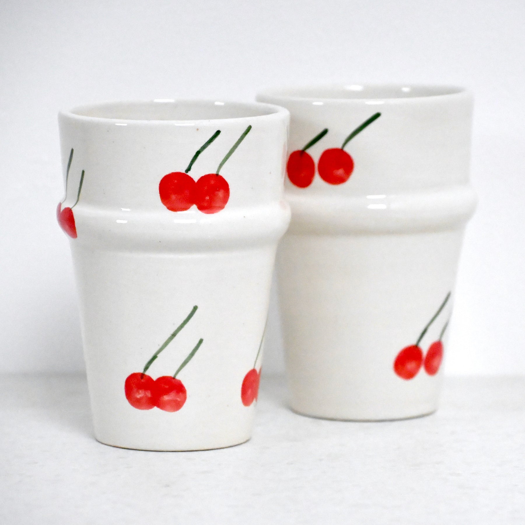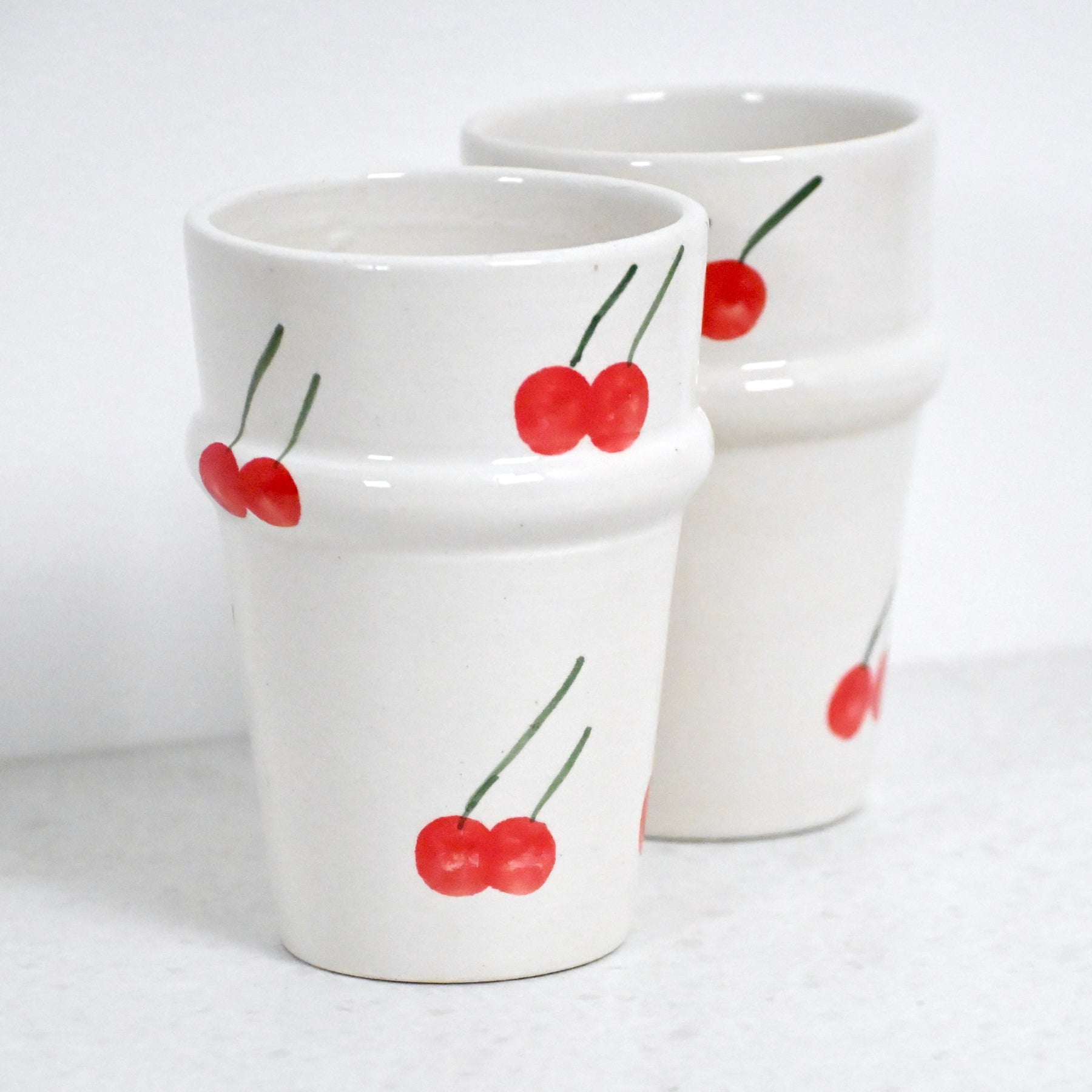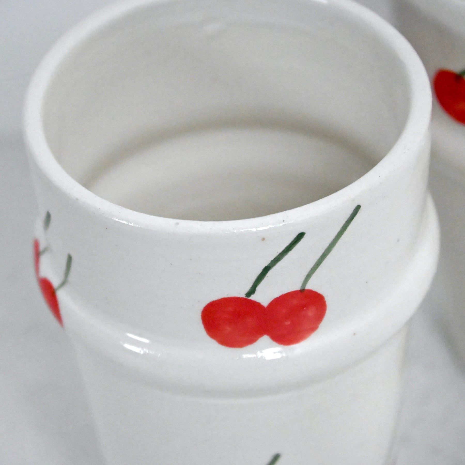 Commencez la journée avec douceur grâce à la tasse, en terre cuite émaillée, orné de cerises peintes à la main dans des tons lumineux : rouge, vert et blanc.